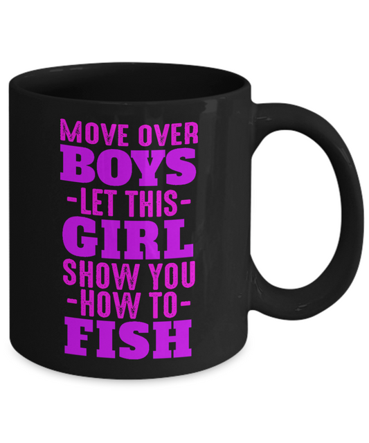 Fishing Love Coffee Mug, Let The Girl Show You How To Fish-Black Porcelain Coffee Mug 11 oz for dad, fishing, fishermen, son, Daughter