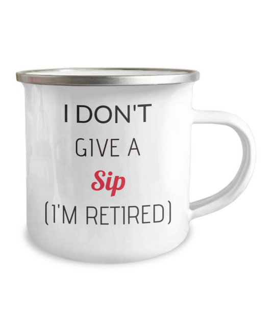 Funny Humorous Retirement Coffee Mug for Retirees I Don't Give a Sip I'm Retired-12 Oz Stainless Steel Enamel Finish White Camper Coffee Mug