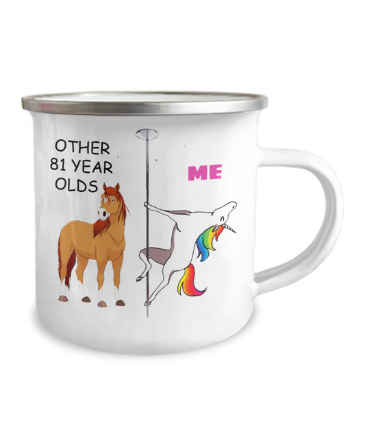 81st Birthday Unicorn Camper Coffee Mug - Other 81 Year Olds Me Unicorn Coffee Mug -12 Oz Stainless Steel Enamel Finish White Camper Coffee Mug