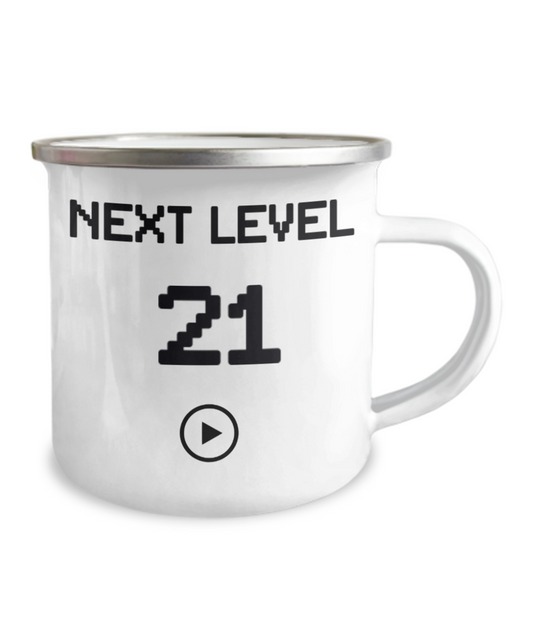 21st Birthday Special Gift Coffee Mug, Next Level 21, Gamer Coffee Mug, Birthday Mug- 12 Oz Stainless Steel Enamel Finish White Camper Coffee Mug