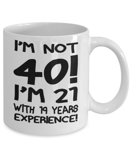 40th birthday mug gifts , I'm not 40, I'm 21 with 19 years Experience - White Coffee Mug Tea Cup 11 oz Gift