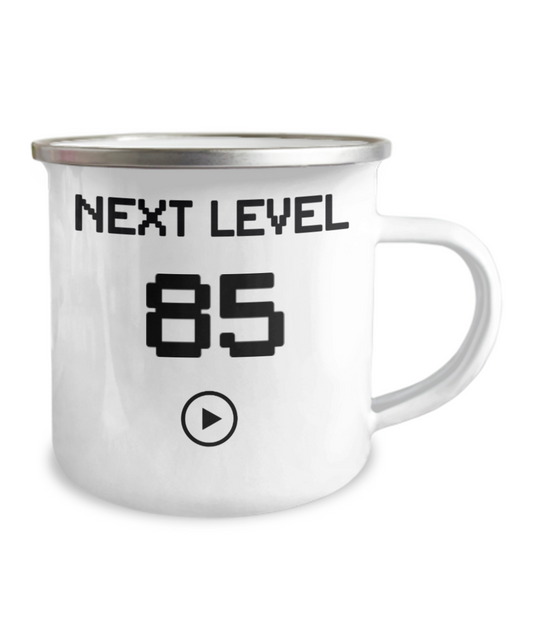 85th Birthday Coffee Mug, Next Level 85, Gamer Coffee Mug, Birthday Mug- 12 Oz Stainless Steel Enamel Finish White Camper Coffee Mug