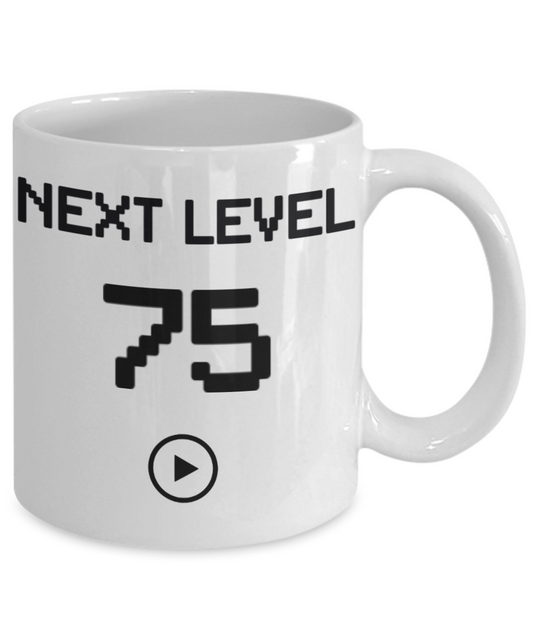 75th Birthday Coffee Mug, Next Level 75, Gamer Coffee Mug, Birthday Mug- White Porcelain Coffee Mug 11 Oz Birthday Coffee Mug