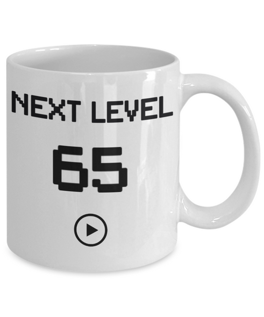 65th Birthday Coffee Mug, Next Level 65, Gamer Coffee Mug, Birthday Mug- White Porcelain Coffee Mug 11 Oz Birthday Coffee Mug