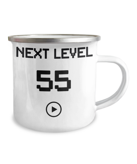 55th Birthday Coffee Mug, Next Level 55, Gamer Coffee Mug, Birthday Mug- 12 Oz Stainless Steel Enamel Finish White Camper Coffee Mug