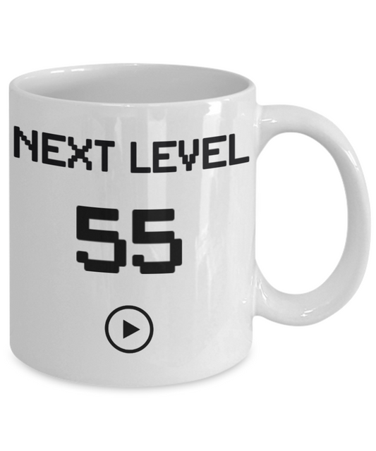55th Birthday Coffee Mug, Next Level 55, Gamer Coffee Mug, Birthday Mug- White Porcelain Coffee Mug 11 Oz Birthday Coffee Mug