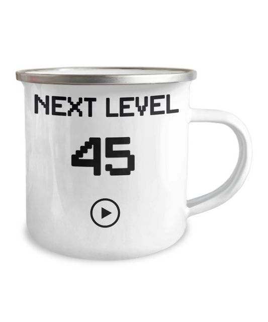 45th Birthday Special Gift Coffee Mug, Next Level 45, Gamer Coffee Mug, Birthday Mug- 12 Oz Stainless Steel Enamel Finish White Camper Coffee Mug