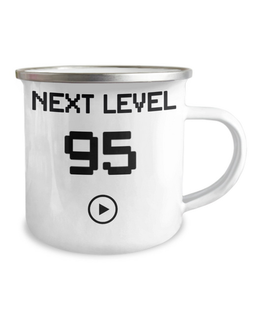 95th Birthday Coffee Mug, Next Level 95, Gamer Coffee Mug, Birthday Mug- 12 Oz Stainless Steel Enamel Finish White Camper Coffee Mug