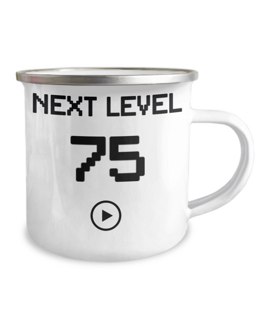 75th Birthday Coffee Mug, Next Level 75, Gamer Coffee Mug, Birthday Mug- 12 Oz Stainless Steel Enamel Finish White Camper Coffee Mug