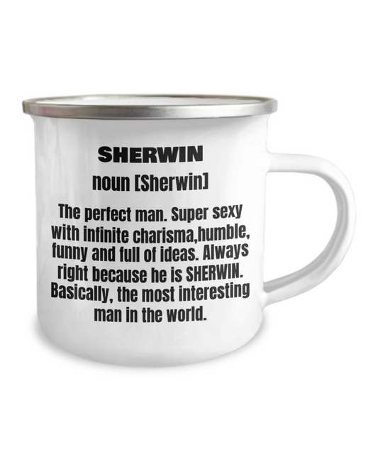 Sherwin First Name Adult Definition - Premium 12 Oz Stainless Steel Enamel Finish White Camper Coffee Mug