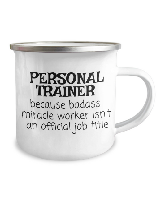 Personal Trainer Coffee Mug , Badass Miracle Worker Isn't An Official Job Title - 12 Oz Stainless Steel Enamel Finish White Camper Coffee Mug