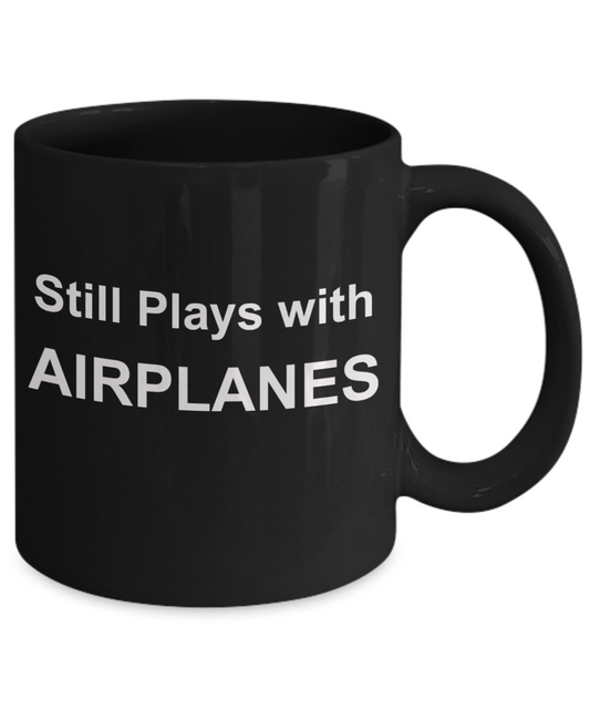 Pilot shot glass quotes mugs, Still plays with Airplanes - Black Porcelain Coffee 11 oz