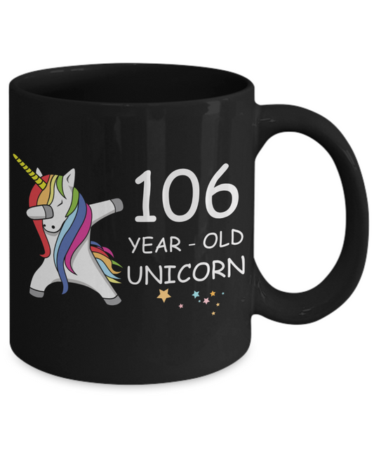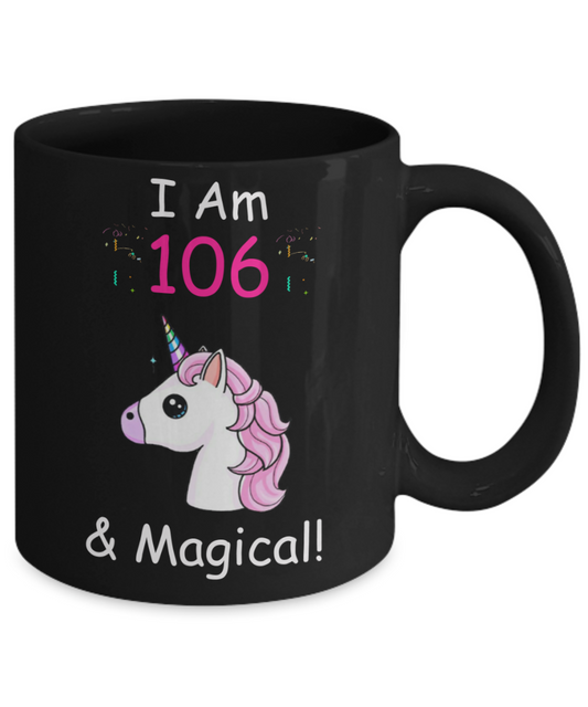 106th Birthday Gift for Women - I Am 106 & Magical Unicorn Mug - Funny Black Porcelain Coffee 11 oz for Grandma, Mom, Sister, Best Friend, Women, Her -Queens are Born In 1914