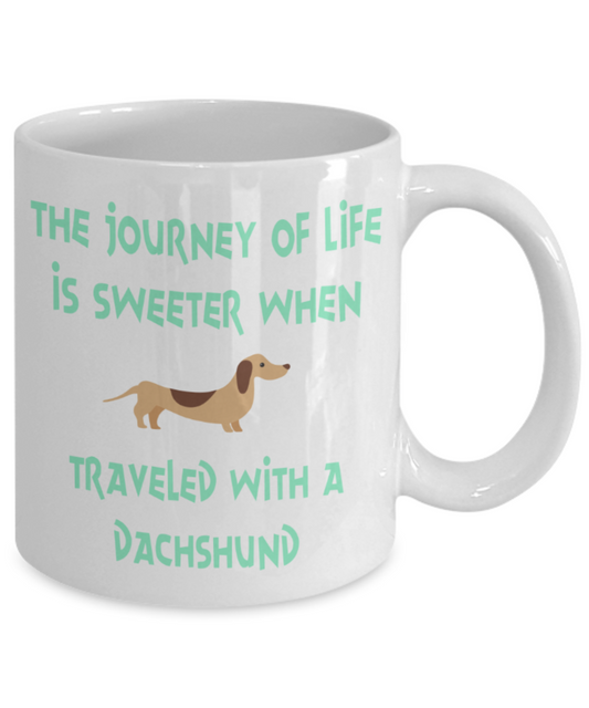 Animals and Pets Lovers Gifts , Journey is sweeter with Dashchund - White Coffee Mug Porcelain Tea Cup 11 oz - Great Gift