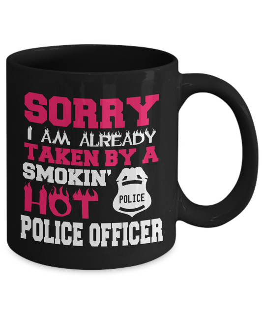 Police Officer Gift Coffee mug, Sorry I Am Already Taken By A Smokin Hot Police Officer-Black Porcelain Coffee Mug 11 oz For Police, Cop, Girlfriend, Boyfriend