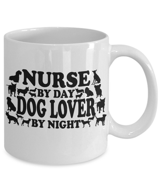 Nurse Appreciation Gift Coffee mug, Nurse By Day Dog Lover By Night-White Porcelain Coffee Mug 11 oz for Girlfriend, Father, Boyfriend, Wife, Husband,Nurse,medical, Nursing , Student