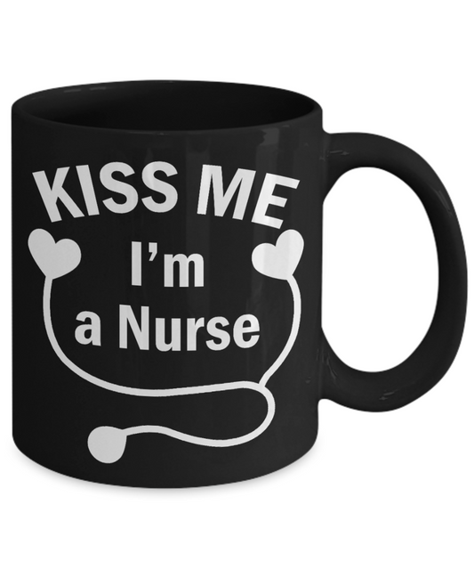 Nurse Graduation Gift Coffee mug, Kiss Me I Am A Nurse-Black Porcelain Coffee Mug 11 oz for Girlfriend, Boyfriend, Wife, Husband, Nurse, medical, Nursing , Student