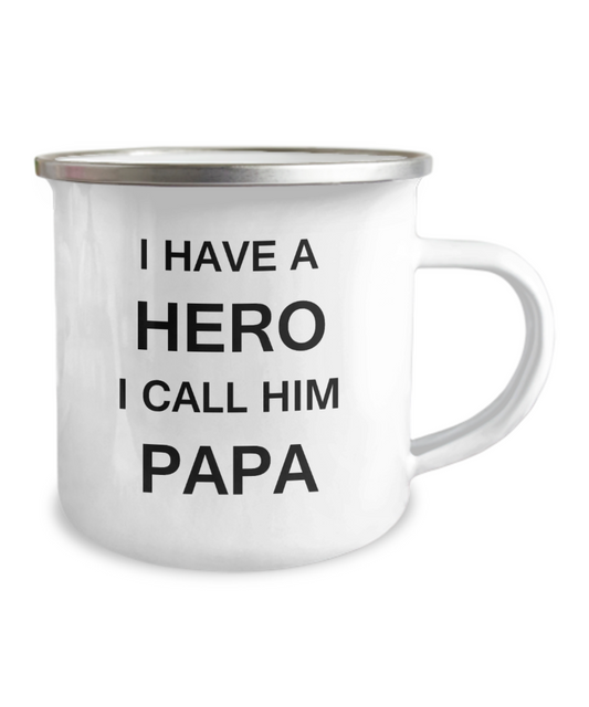 Funny Father's Day Coffee mug- I HAVE A HERO I CALL HIM PAPA - Premium 12 Oz Stainless Steel Enamel Finish White Camper Coffee Mug
