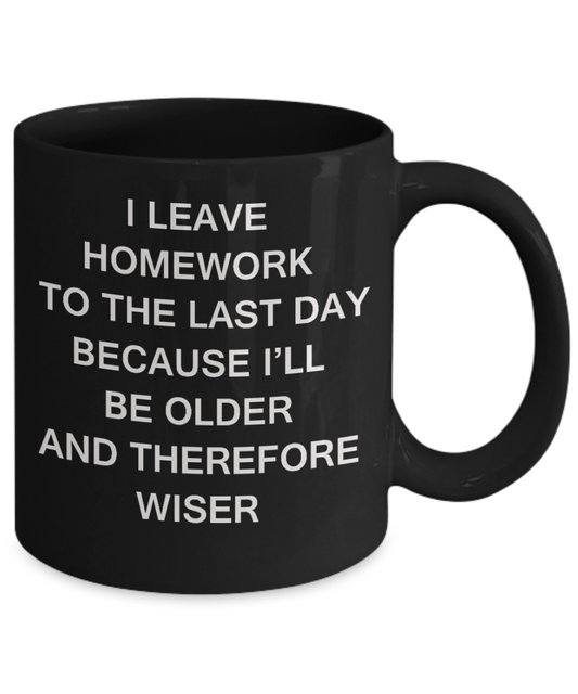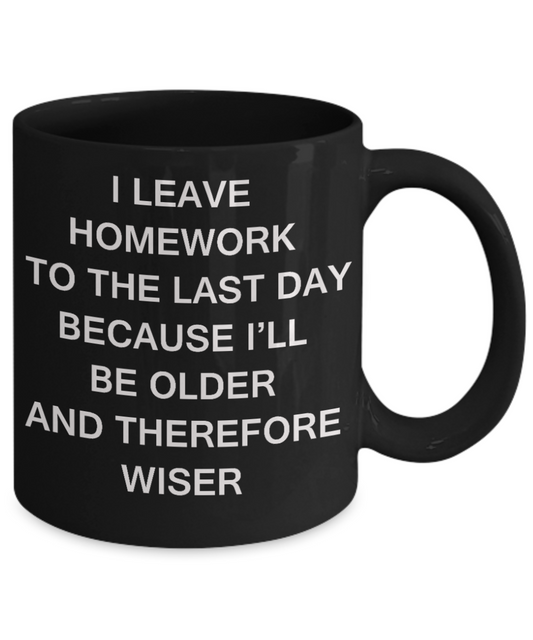 Funny Homework Mugs for teen boys and girls - I Leave Homework To Last Day - Porcelain Black Coffee Mug 11 oz