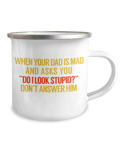 When Your Dad Is Mad And Asks You Do I Look Stupid Don't Answer Him-12 Oz Stainless Steel Enamel Finish White Camper Coffee Mug