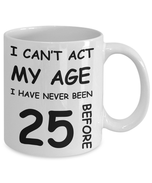 25th Birthday Gift for Women & Men - I can't act my Age, I have never been 25 Before - Funny White Porcelain Coffee 11 oz for Grandma, Mom, Sister, Best Friend, Women, Her - Born In 1995