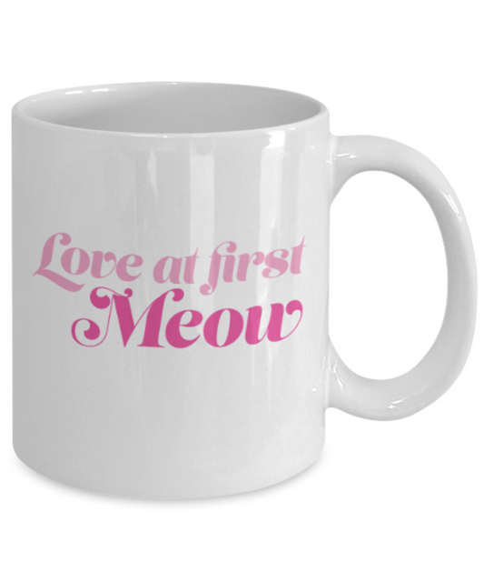 Gift gor cat lovers , Love at First Meow - White Coffee Mug Porcelain Tea Cup 11 oz - Great Gift