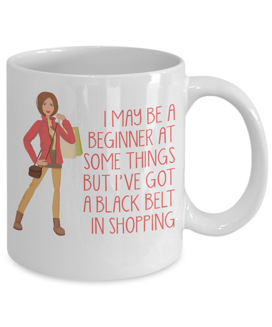 Crazy Lady Coffee Mug, I May Be A Beginner At Some Things But I've Got A Black Belt In Shopping-White Porcelain Coffee Mug 11 oz