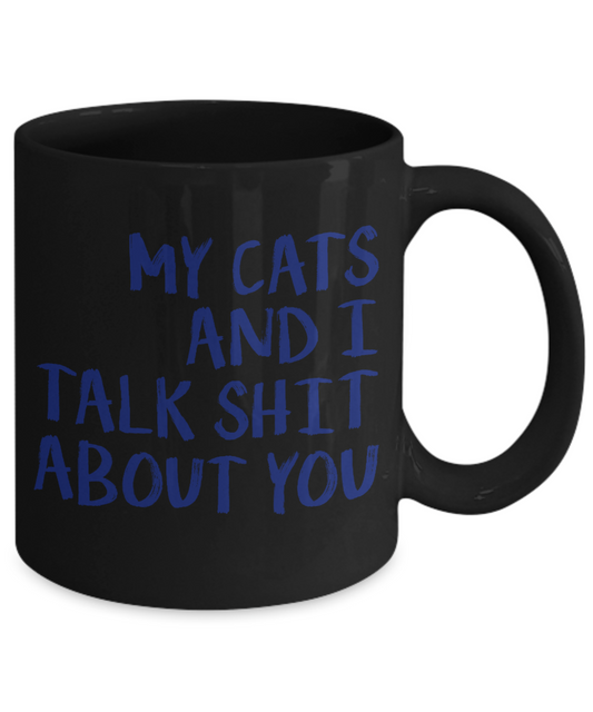 Cat Lover Coffee Mug, My Cats And I Talk Shit About You- Black Porcelain Coffee Mug 11 Oz for cat lover, mom, dad