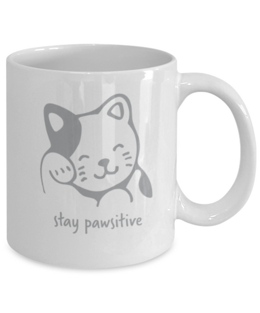 Gift gor cat lovers , Stay Pawsitive - White Coffee Mug Porcelain Tea Cup 11 oz - Great Gift