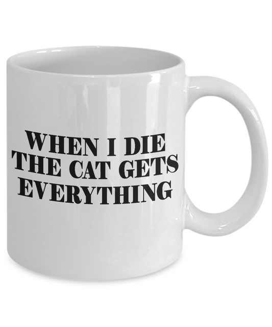 Cat Lover Coffee Mug, When I Die The Cat Gets Everything - White Porcelain Coffee Mug 11 Oz for cat lover, mom, dad