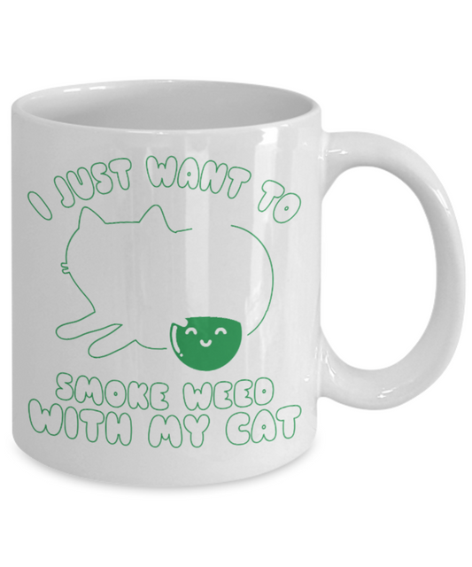 Cat Lovers Mugs , Smoke weed with my cat - White Coffee Mug Porcelain Tea Cup 11 oz - Great Gift