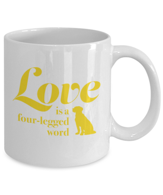 Cat Lovers Gifts , Love is a four legged word - White Coffee Mug Porcelain Tea Cup 11 oz - Great Gift