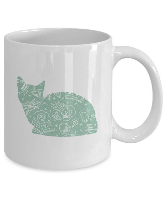 Cat Lovers Gifts , Cats & Tats - White Coffee Mug Porcelain Tea Cup 11 oz - Great Gift