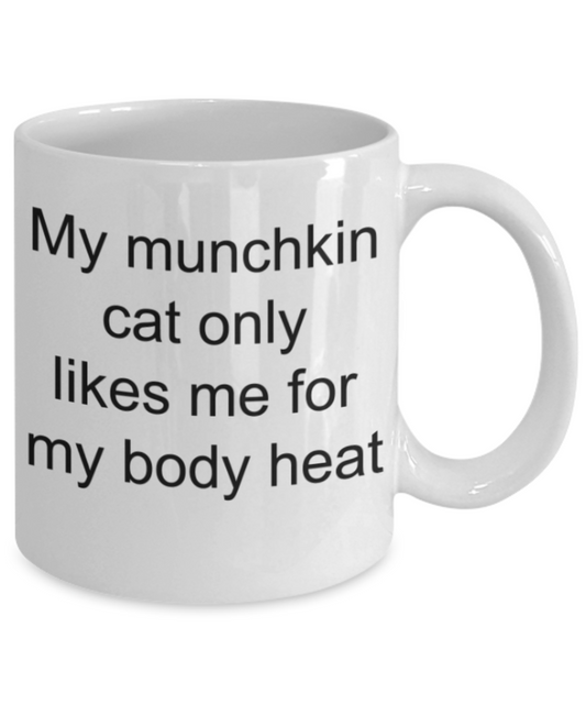 cat lovers gifts mugs, My munchkin cat only likes me for body heat - Funny White Porcelain Coffee Mug Cute Ceramic Cup 11 oz