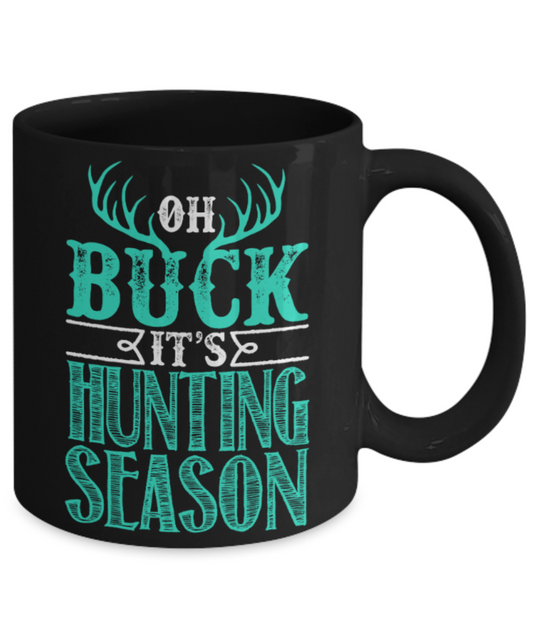 Deer Lovers Mugs , Oh buck It's hunting season - Black Coffee Mug Porcelain Tea Cup 11 oz - Great Gift
