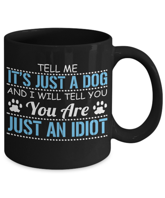 Dog Lover Coffee Mug, Tell Me It's Just A Dog And I Will Tell You You Are Just an Idiot- Black Porcelain Coffee Mug 11 Oz For Dog Lover, Dad, Mom