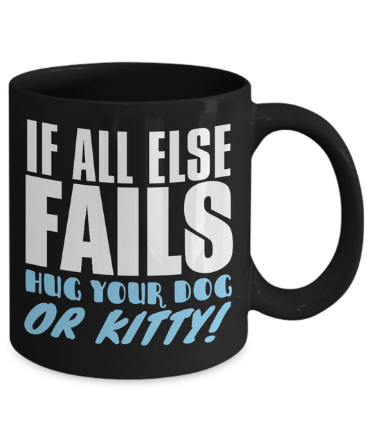 Dog Lover Coffee Mug, If All Else Fails Hug Your Dog Or Kitty - Black Porcelain Coffee Mug 11 Oz