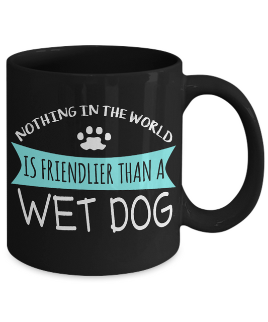 Dog Lover Coffee Mug, Nothing In The World Is friendlier Than A Wet Dog - Black Porcelain Coffee Mug 11 Oz