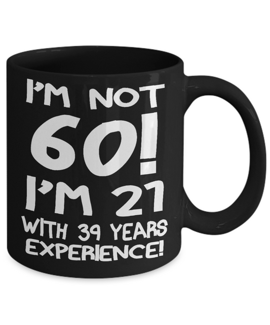 60th Birthday Gift Coffee mug, I Am Not 60 I Am 21 With 39 Years Experience-Black Porcelain Coffee Mug 11 oz