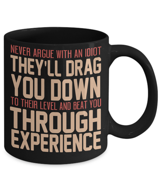 Never Argue With An Idiot They'll Drag You Down To Their Level And Beat You Through Experience-Black Porcelain Coffee Mug 11 Oz