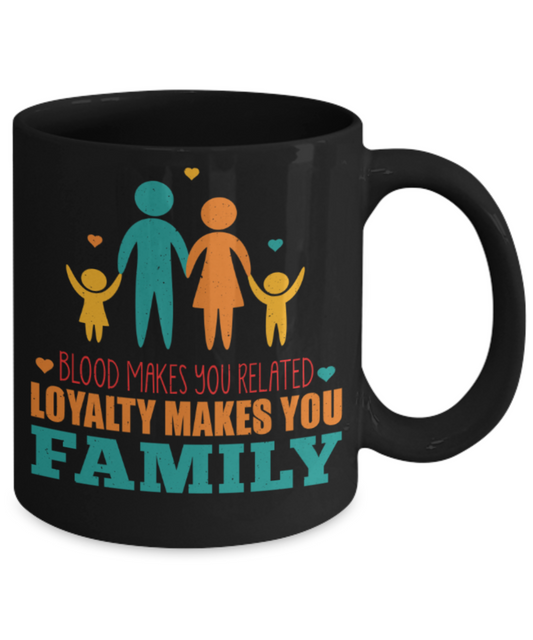 Family Lovers Mugs, Blood makes you related Loyality makes you Family - Funny Black Porcelain Coffee 11 oz
