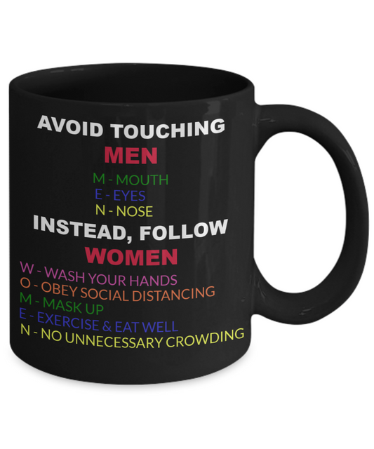 Funny Mug-Avoid Touching MEN Instead, Follow WOMEN Coffee Mug Funny Saying,Birthday Gifts, Gifts for men and women 11 oz Black coffee mug