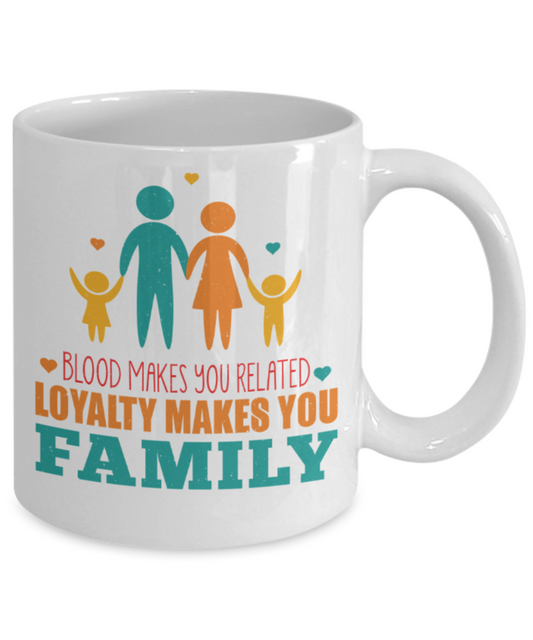 Family Lovers Mugs, Blood makes you related Loyality makes you Family - Funny White Porcelain Coffee 11 oz