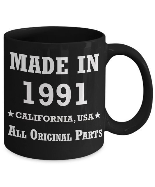 28th birthday gifts for men - Made in 1991 All Original Parts California - Best 28th Birthday Gifts for family Ceramic Cup Black, Funny Mugs Gift Ideas 11 Oz