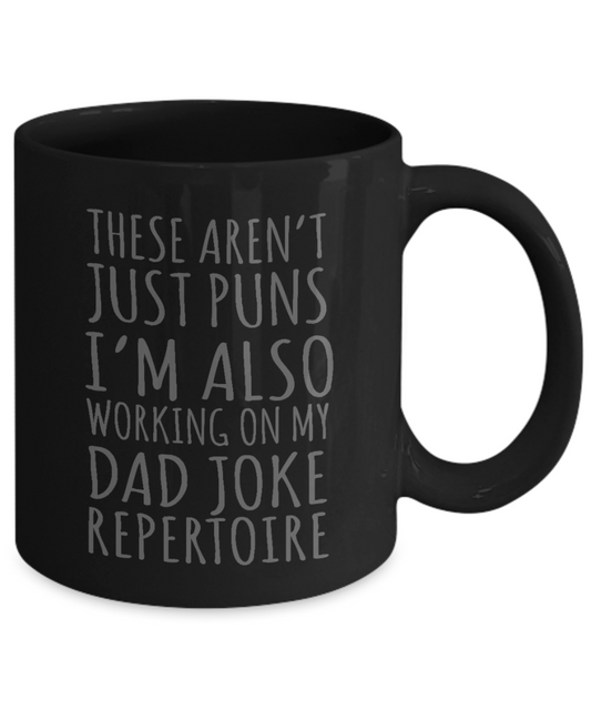 Dear Dad Coffee Mug, These Aren't Just Puns I'm Also Working On My Dad Joke Repertoire-Black Porcelain Coffee Mug 11 oz