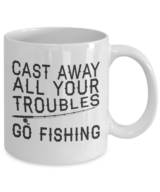 Fishing Love Coffee Mug,Cast Away All Your Troubles Go Fishing-White Porcelain Coffee Mug 11 oz for dad, fishing, fishermen, son, Daughter