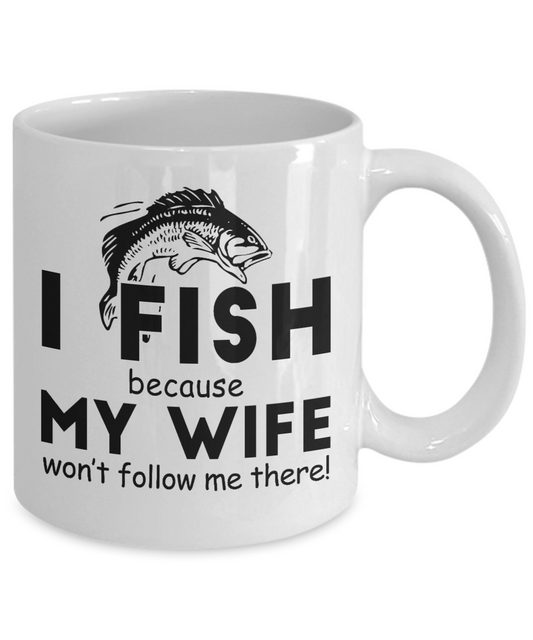 Fishing Love Coffee Mug,I Fish Because My Wife Won't Follow Me There-White Porcelain Coffee Mug 11 oz for dad, fishing, fishermen, son