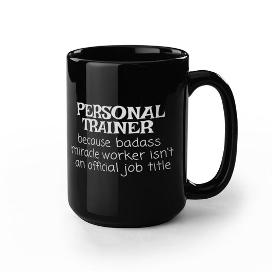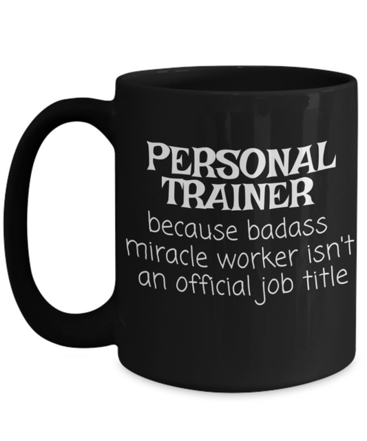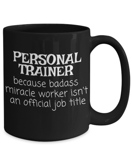 Personal trainer coffee mug, gym trainer, fitness trainer mug, badass miracle worker isn't an official job title-black porcelain coffee mug 15 oz