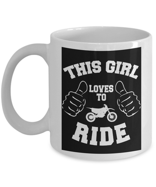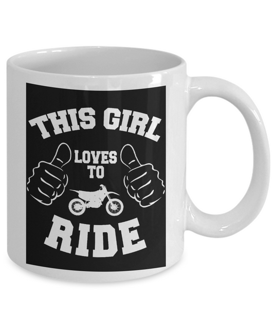 Motorcycle Rider Gift Coffee Mug, This Girl Loves To Ride - White Porcelain Coffee Mug 11 oz For Bike, Rider, Girlfriend, For Her, Mother, Sister, Women