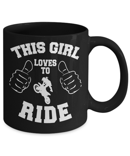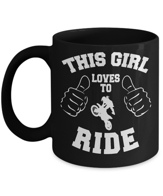Motorcycle Rider Gift Coffee Mug, This Girl Loves To Ride -Black Porcelain Coffee Mug 11 oz For Bike, Rider, Girlfriend, For Her, Mother, Sister, Women